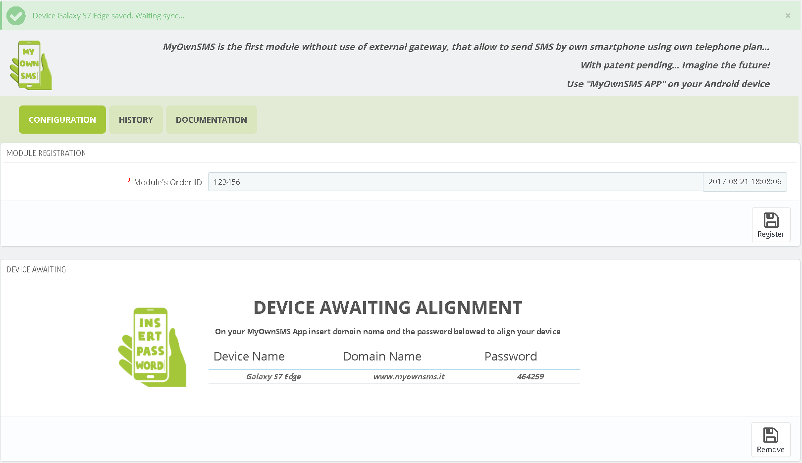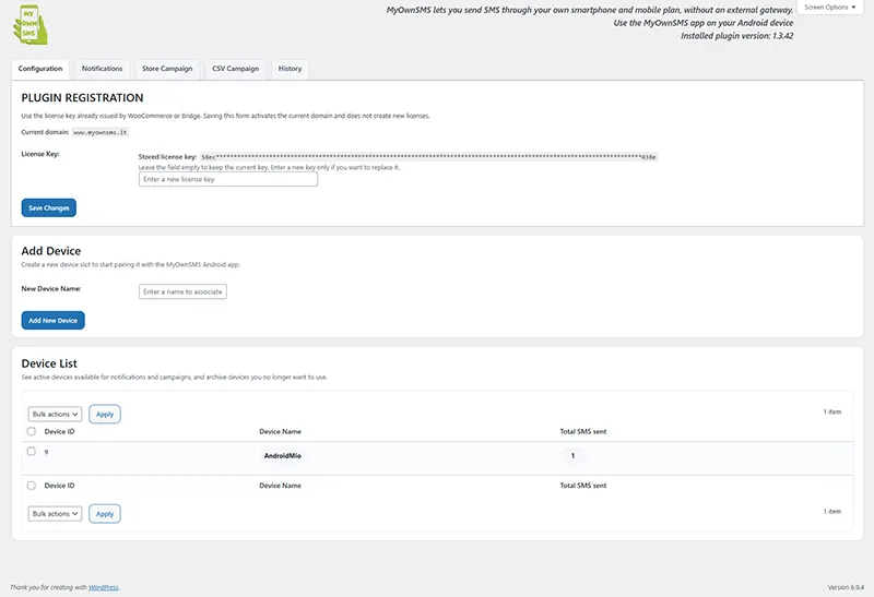 Enter the license key received after purchase to activate MyOwnSMS on your domain. Once the license is validated, your store is ready to move to the next step and connect your Android device.