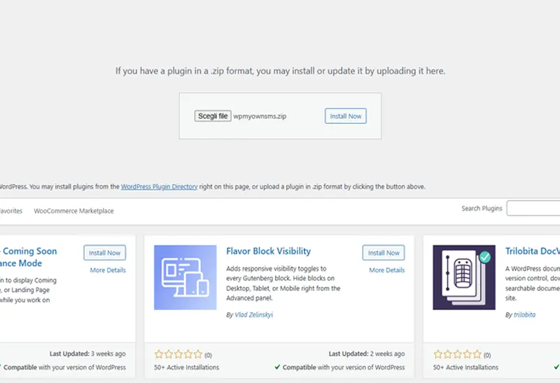 Install the MyOwnSMS plugin on your WordPress or WooCommerce store to connect your website to the platform. This is the first step that prepares your store for license activation, device pairing, and SMS operations.